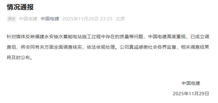 央视网消息 据中国电建微信公众号消息,中国电建11月29日晚发布情况通报,针对媒体反映福建永安抽水蓄能电站施工过程中存在的质量等问题,中国电建高度重视,已成立调查组,将会同有关方面全面调查核实,依法依规处理。公司真诚感谢社会各界监督,相关调查结