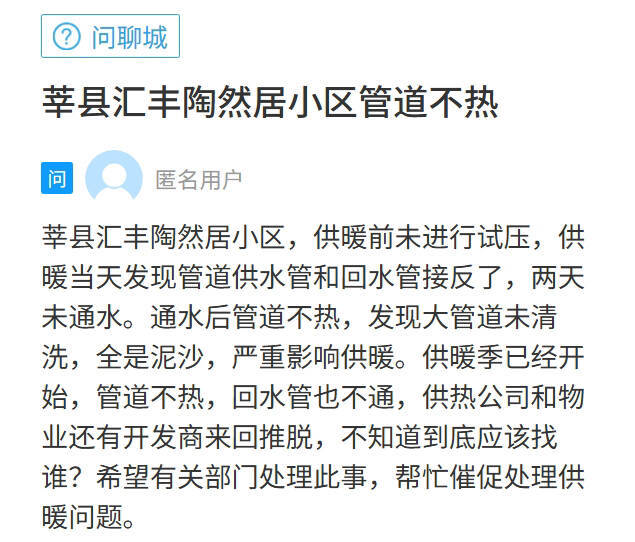 齐鲁网·闪电新闻11月30日讯聊城的一位网友在闪电新闻网络问政平台留言 在莘县汇丰陶然居小区,供暖前未进行试压。供热公司和物业还有开发商来回推脱,不知道到底应该找谁。收到留言后,莘县综合行政执法局进行了办理并回复 汇丰陶然居小区供热系统启动后,发