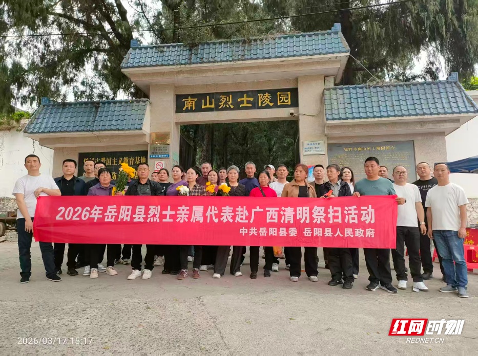 红网时刻新闻3月21日讯3月16日至20日,岳阳县组织36名烈士亲属,赴广西凭祥、靖西等地烈士陵园开展祭扫活动,以实际行动缅怀先烈、关爱烈属,寄托家乡人民对烈士的深切哀思和崇高敬意。“老哥哥,你的照片旧了,这次给你换上新的”。杨立保烈士的兄弟和弟媳去
