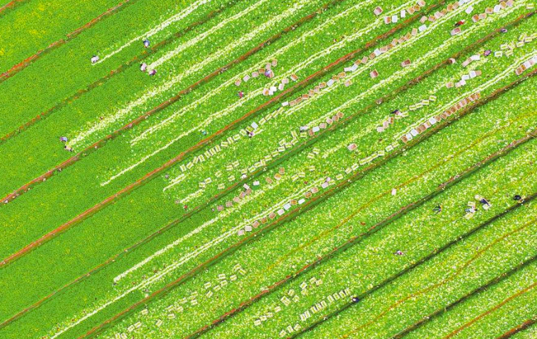 产业工人采收蔬菜。通讯员王勇摄 春节前夕,曲靖市陆良县的田间地头处处一派繁忙景象。 清晨,三岔河镇大咀子村的油麦菜基地里,工人们弯着腰麻利地采收,分拣、打包紧随其后。这菜娇贵,离地就要进箱,得第一时间把鲜锁住。基地负责人袁照笑着说。