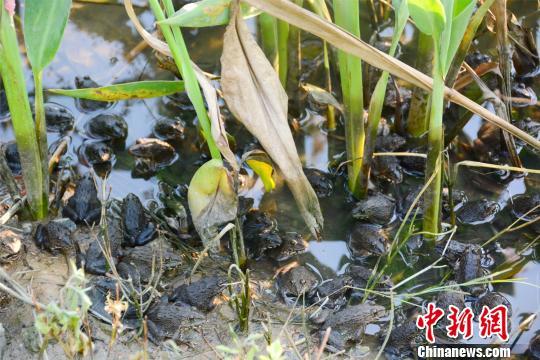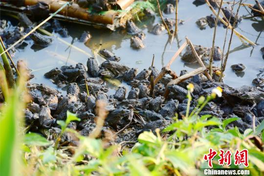 广州花都志惠农场池塘出现大量青蛙 曾令华 摄