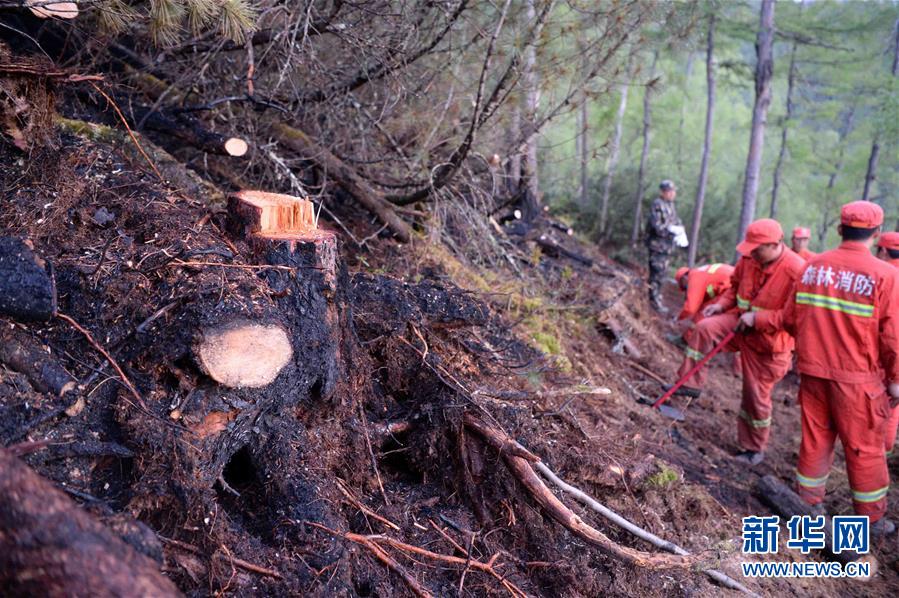 扑火队员在黑龙江大兴安岭呼中火场一线清理(6月6日摄)。新华社记者王凯摄