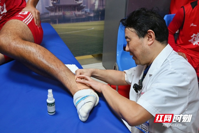 “南詹正骨”第四代传承人尹书东为球员做康复理疗。康复理疗现场。红网时刻新闻10月16日讯10月15日晚,衡阳市体育中心的训练场上,湘超衡阳队队员正在为下一场赛事全力备战
