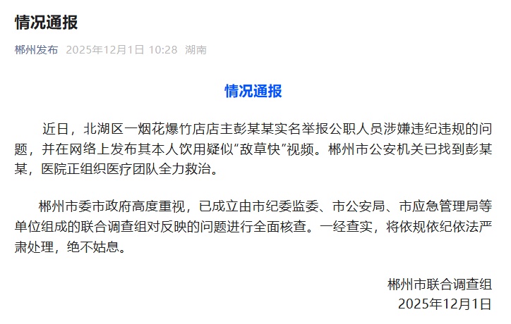 央视网消息 12月1日,湖南省郴州市联合调查组发布情况通报 近日,北湖区一烟花爆竹店店主彭某某实名举报公职人员涉嫌违纪违规的问题,并在网络上发布其本人饮用疑似“敌草快”视频。郴州市公安机关已找到彭某某,医院正组织医疗团队全力救治。郴州市委市政府
