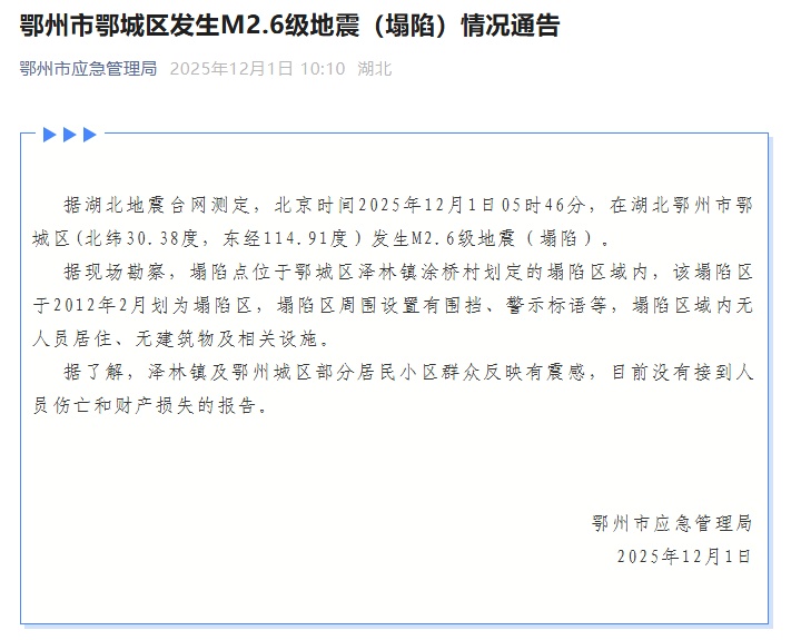 央视网消息 鄂州市应急管理局12月1日通报,据湖北地震台网测定,北京时间2025年12月1日05时46分,在湖北鄂州市鄂城区发生M2.6级地震。据现场勘察,塌陷点位于鄂城区泽林镇涂桥村划定的塌陷区域内,该塌陷区于2012年2月划为塌陷区,塌陷区周围设置有围挡、警示