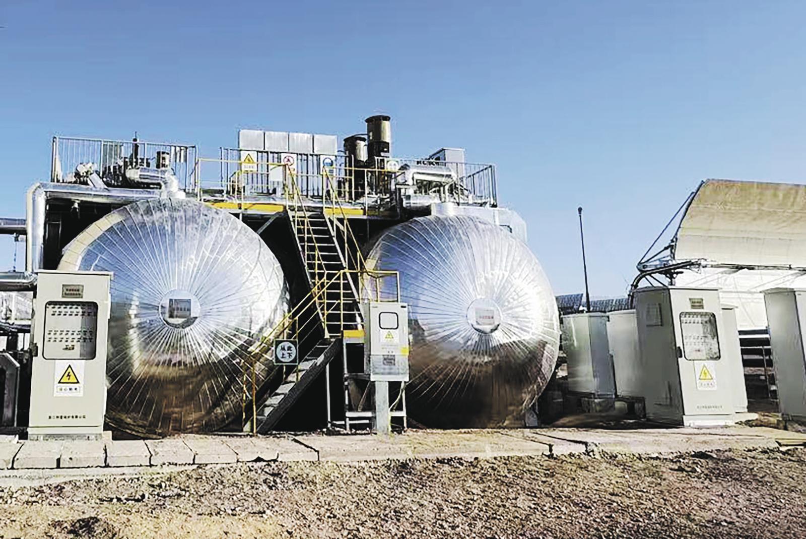 熔盐储罐区域。在中广核新一代大开口熔盐槽式集热器中试基地,一个个8.6米大开口槽式集热器如“追光战士”般向阳矗立,巨大的反射镜在阳光下熠熠生辉。“光热发电是破解新能源波动性、保障绿电稳定供应的关键技术,中广核牵头开展核心装备自主化研制并依托基