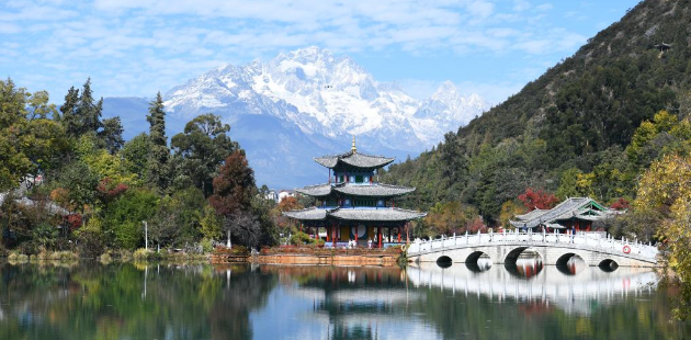 初冬时节,云南丽江玉龙雪山与山下层林互相辉映,美不胜收。