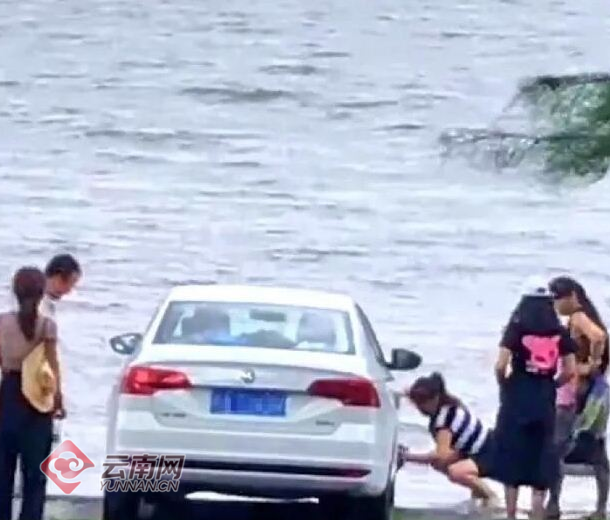 游客把轿车停在洱海边洗