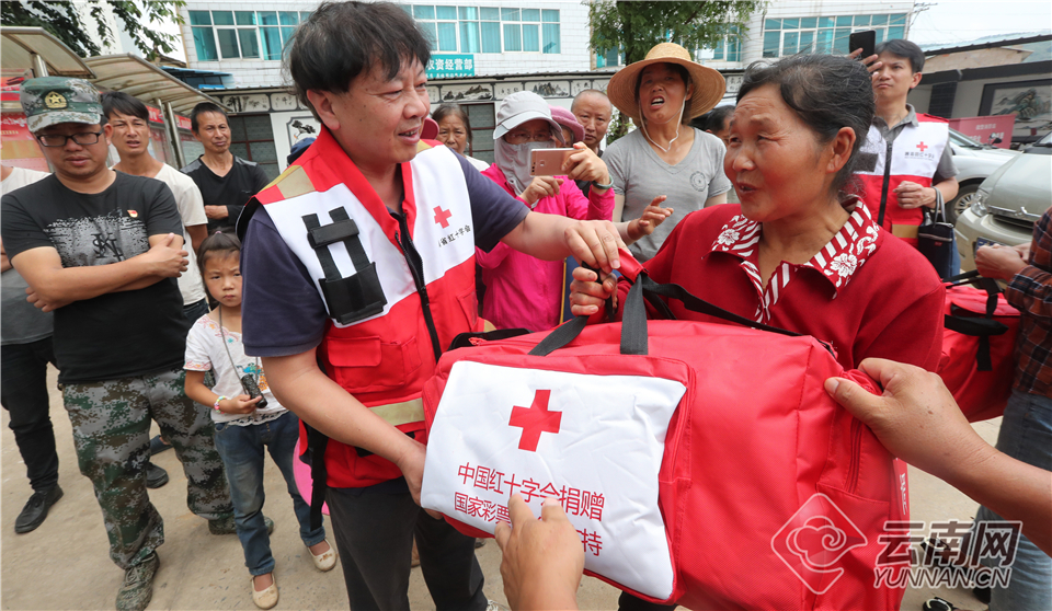 云南网讯 8月15日,云南省红十字会抗震救灾工作组在玉溪市通海县四街镇者湾村开展救助家庭包移交发放活动,为受灾低保困难户和残疾困难户家庭送来了充满爱心的帮扶大“礼包”。