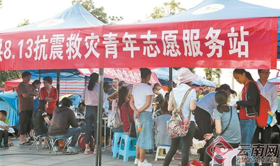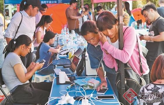 在通海县新城区政府广场,因受地震惊吓,周边小区群众纷纷在广场上搭起帐篷住下。记者在现场看到,通信、饮用水等志愿服务队纷纷搭建帐篷设置了服务点,为群众提供休息场地,还提供了多部电话供大家现场免费使用、免费充电,并免费提供饮用水和常用药品,移动公司还将互联网电视带到了服务点,让避险群众可以收看电视。