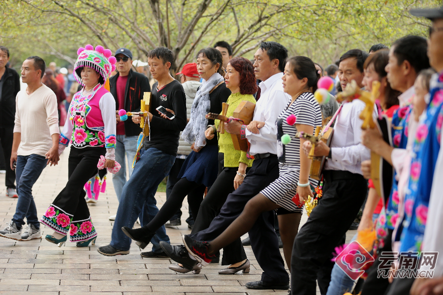 昆明翠湖公园,许多身着民族服饰的群众跳起左脚舞度过欢乐假期。记者 周灿 摄