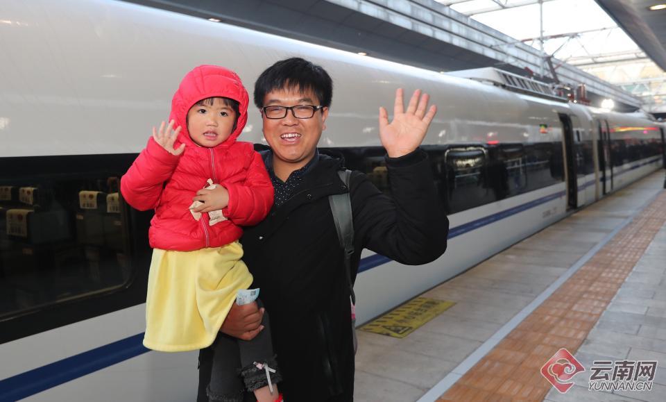 首批乘客在昆明站乘坐“高原动车”前往丽江。