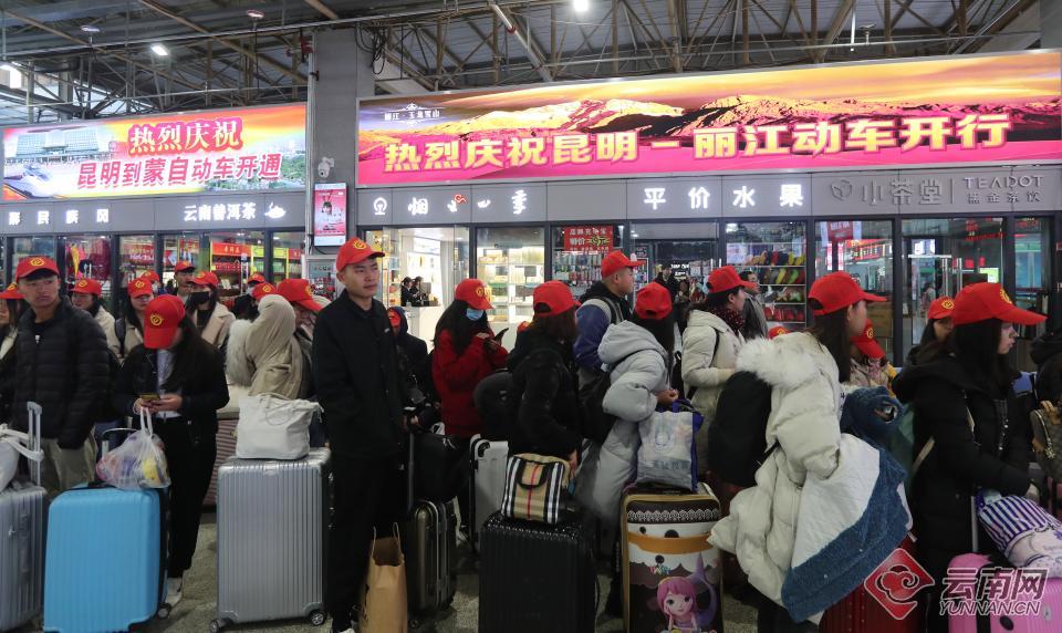 首批乘客在昆明站乘坐“高原动车”前往丽江。