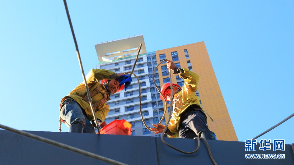 由于经常攀爬在城市高楼外墙上进行清洁,他们被称为“蜘蛛人”。他们每天要清洗大约200平方米至300平方米的外墙。如果遇到有屋檐、有民族特色的房屋,他们的工作量会增加一倍。图为高空清洗人员正在放置绳索(范芳钰/文 潘越/图)