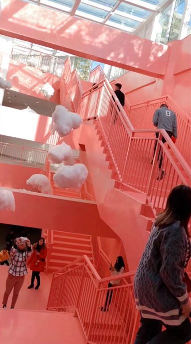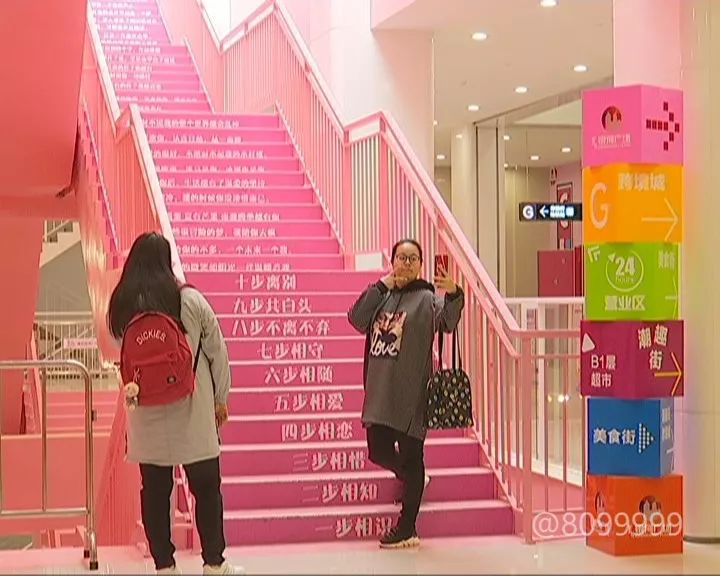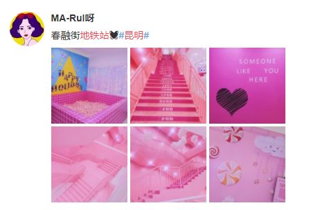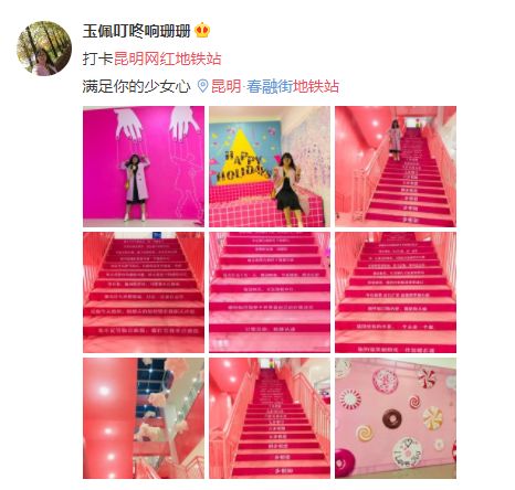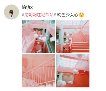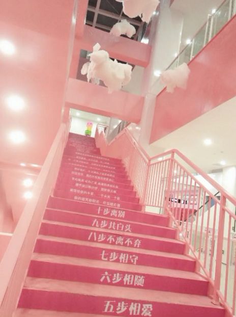 昨天记者也去实地走访了一下,进入站内就能看到从楼梯到墙壁满眼都是甜甜的粉红色,上面还飘着朵朵白云。