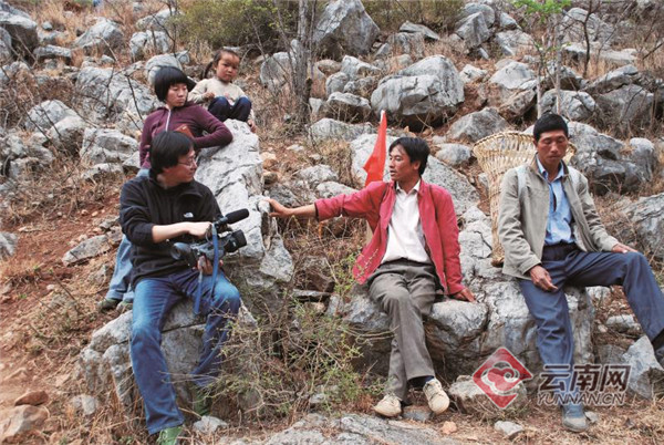 2010年,马路乡岔河村抗旱期间,熊成富在背水途中接受中央电视台记者采访