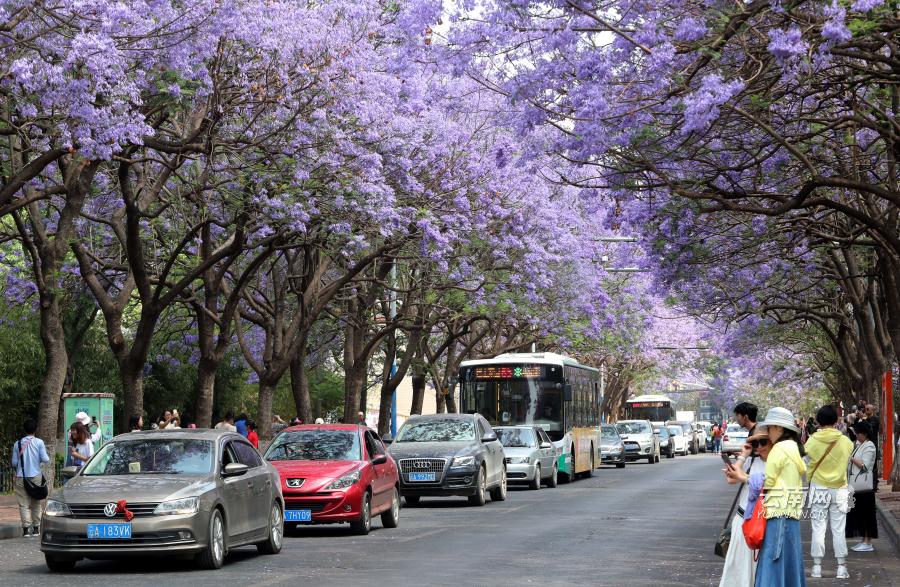 云南网讯(记者 杨峥)“五一”假日,昆明蓝花楹“网红街”——教场中路迎来大批前来赏花拍照的市民游人,可谓是车水马龙,人潮涌动,人气爆棚。在蓝紫色芬芳的蓝花楹大道,游人忙碌着选角度、摆造型、拍美颜、录视频,人们陶醉在梦幻美丽的景致中享受着充满快乐的休闲假日。