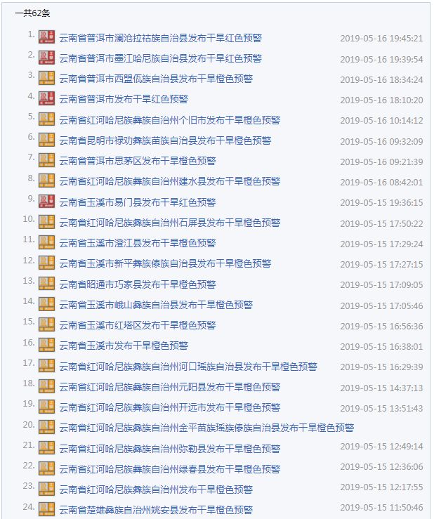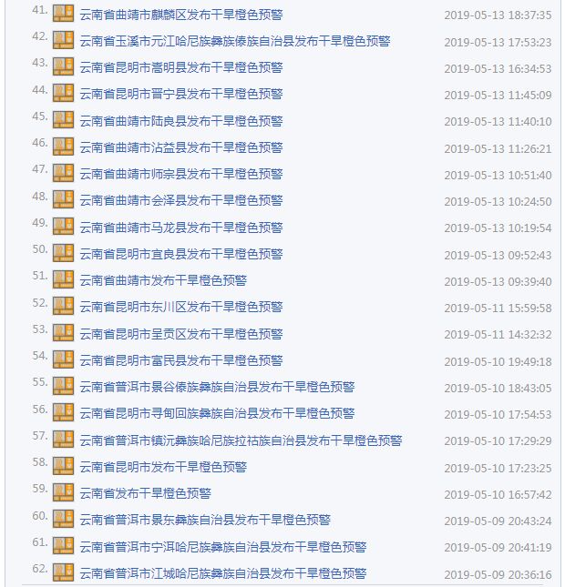 曲靖市气象台5月13日9时发布干旱橙色预警:根据最新气象监测,曲靖市会泽、沾益、麒麟、马龙、陆良、师宗达到气象干旱重旱等级,局部地区特旱,宣威、富源、罗平达到气象干旱中旱等级。