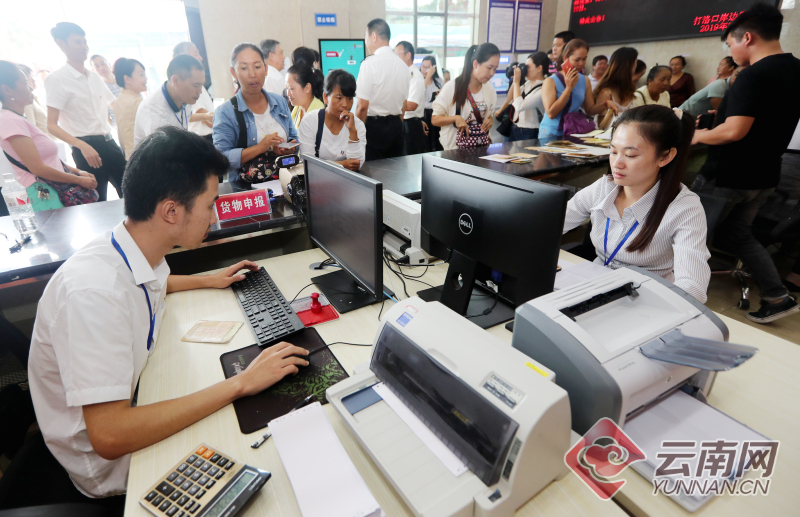 在勐海县打洛口岸边民互市服务中心,前来办理进出口货物申报的边民络绎不绝。