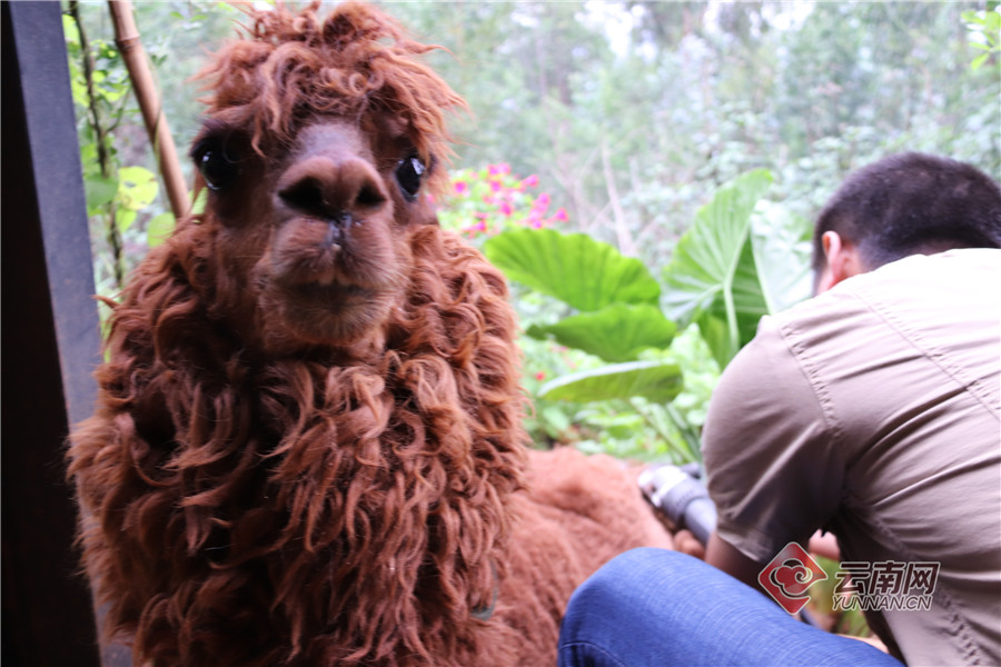 在夏天,最能感受到炎热的可能就是生活在羊村的羊驼了。作为产毛动物的羊驼,很快地便能长出又长又厚的毛,自然而然地,为羊驼消暑的最佳方法便是——“理发”。为羊驼剪去长毛,不但能美容,还能解暑、有效地清理皮毛中夹杂的杂物。为了给羊驼顺利地修剪,云南野生动物园的工作人员准备了专门的羊毛修剪刀,面对嗡嗡震动的刀头,小羊驼起初还显得有些不适应。但是在工作人员的安抚下,小羊驼逐渐安静下来乖乖地配合。最终,小羊驼的背上毛被修剪出了两个小小的“驼峰”形状,成了名副其实的羊“驼”。