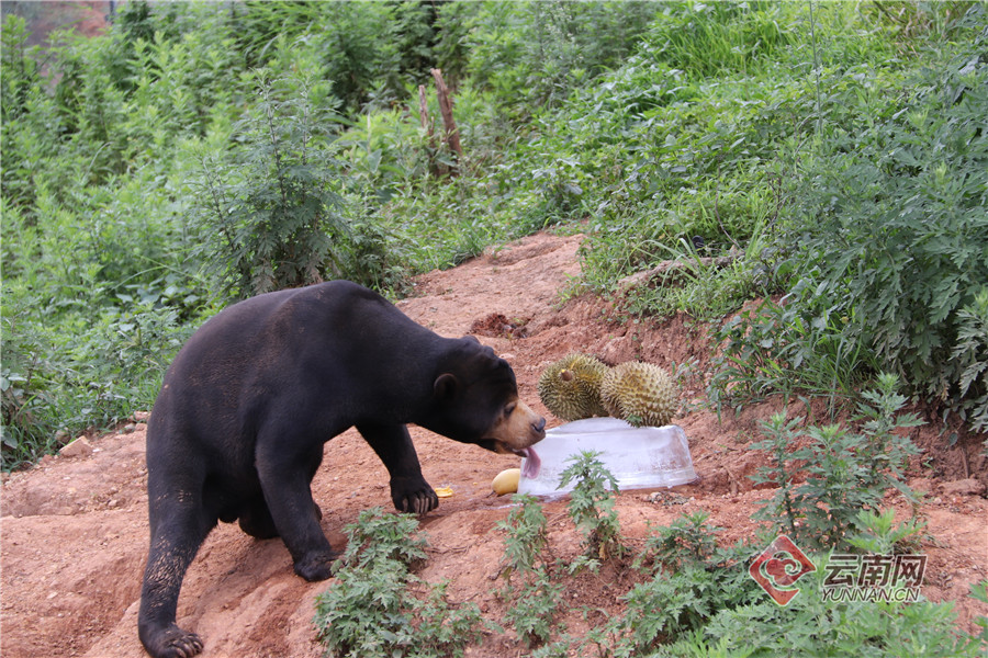 马来熊的家乡和盒马的榴莲基地,都在马来西亚,云南野生动物园的工作人员用冰块、榴莲和芒果,希望来为来自热带的熊们降降暑气。在已经熟透到微微裂开的榴莲所散发出的香气的吸引下,马来熊很快“循味”赶来,抱着冰镇水果便大吃特吃起来。
