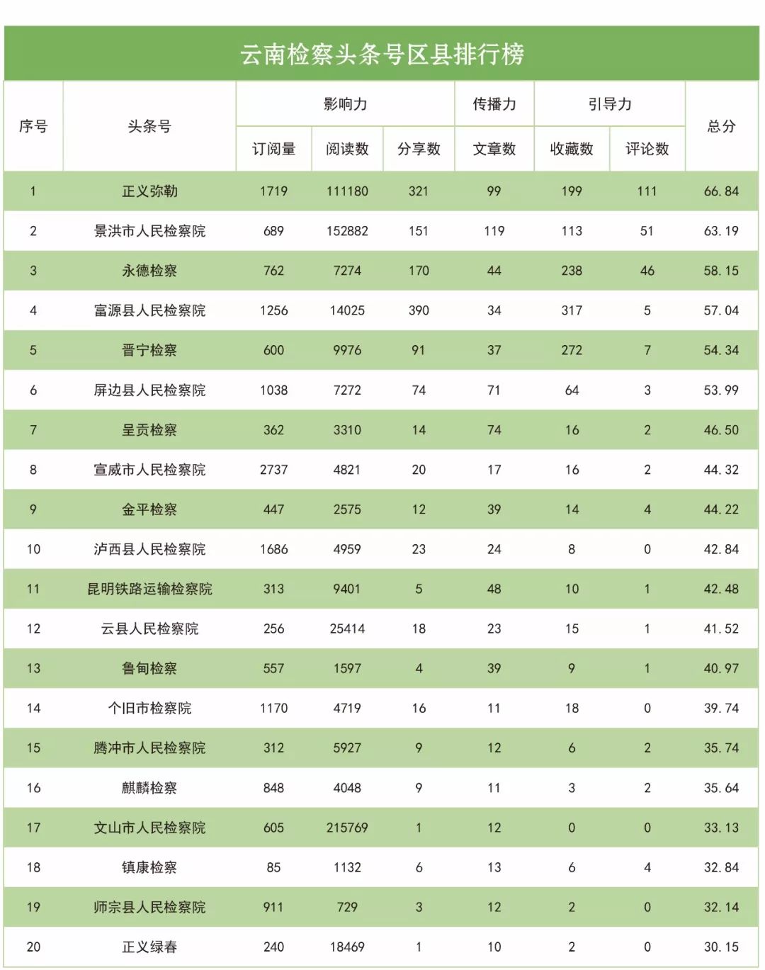 在此次发布的榜单中,曲靖市检察院蝉联指数总榜、微博总榜、头条号总榜首位。从总榜来看,兰坪县检察院发挥稳定,继续蝉联微信总榜冠军。