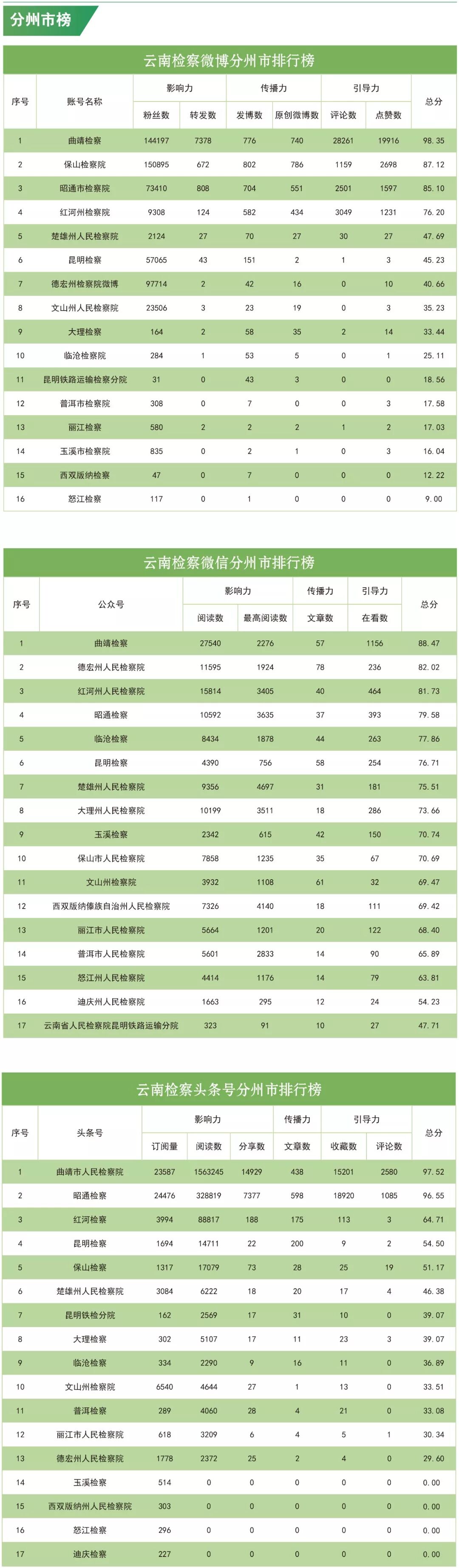 分州市榜中,曲靖市检察院位居微博榜、微信榜、头条号榜第一位。德宏州检察院进步明显,摘得微信榜亚军头衔。