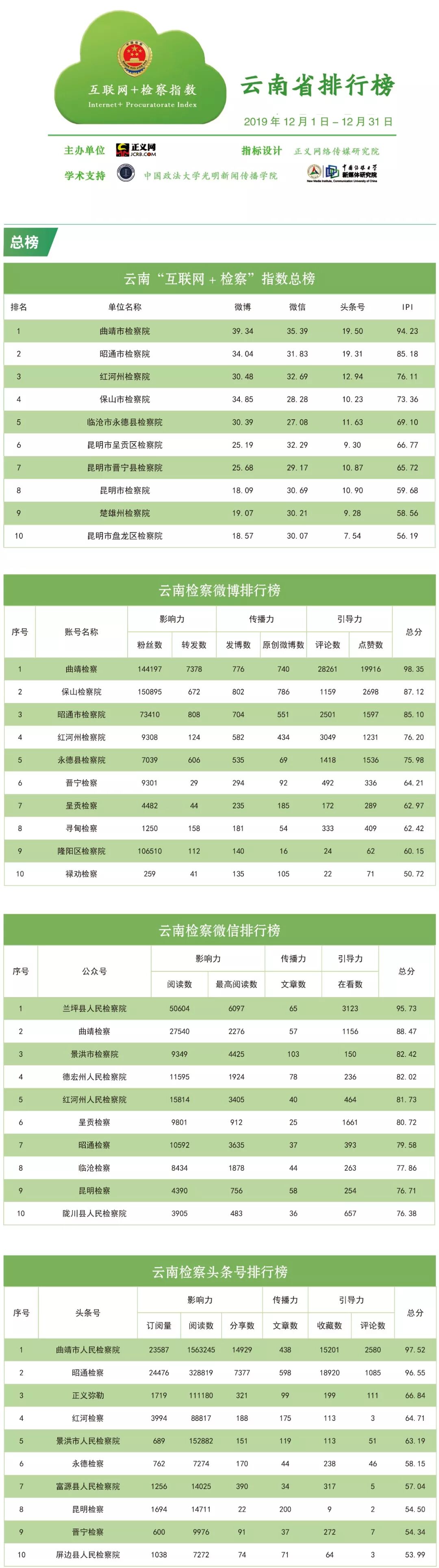本次榜单的监测时段为2019年12月1日至12月31日。此次参评的检察新媒体账号共425个,其中129个检察微博、148个检察微信和148个检察头条号。2019年12月,云南各级检察机关共发布微博10930条,微信文章2125篇,今日头条文章2776篇。