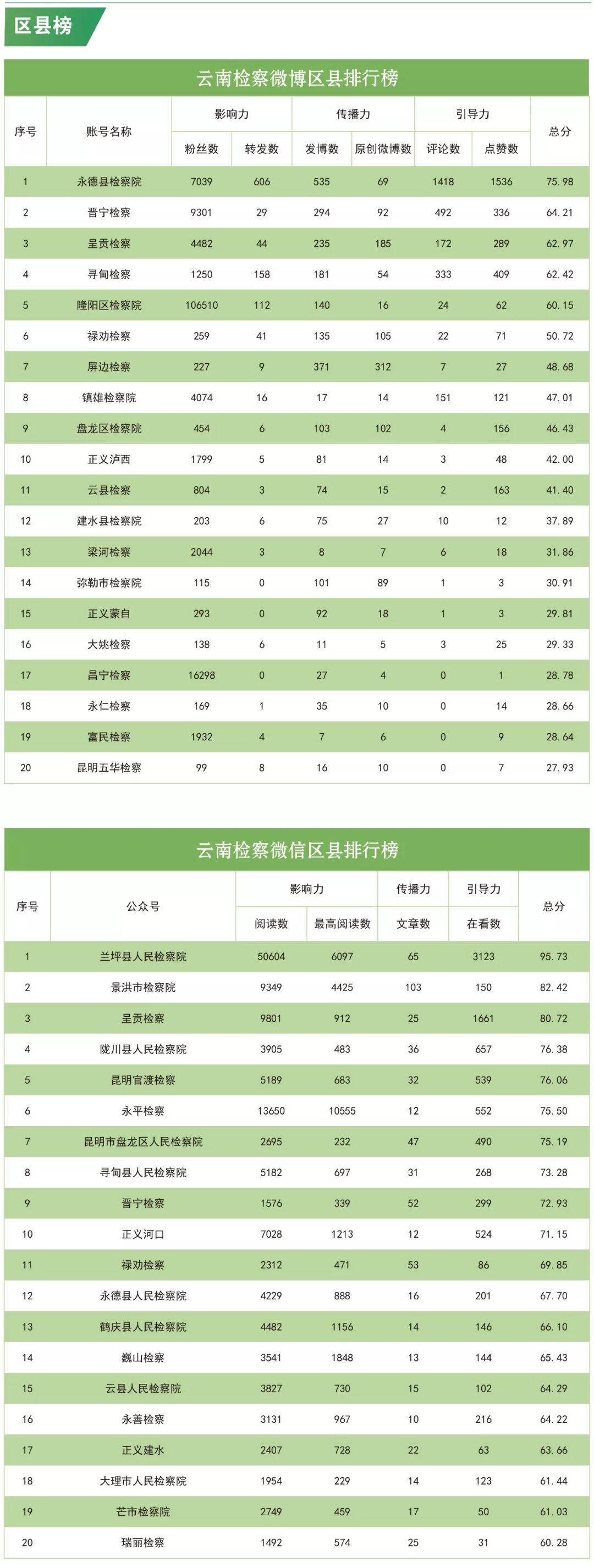 区县榜中,永德县检察院蝉联微博榜冠军,兰坪县检察院继续稳居微信榜冠军,弥勒市检察院再次荣获头条号榜冠军。