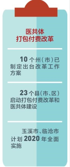 目前,全省已有10个州(市)根据省级指导意见,结合本地实际制定出台了县域内医共体打包付费改革工作方案;禄丰县、彝良县、马关县等23个县(市、区)已启动打包付费改革和医共体建设。玉溪市、临沧市计划2020年以市为单位全面实施打包付费改革。