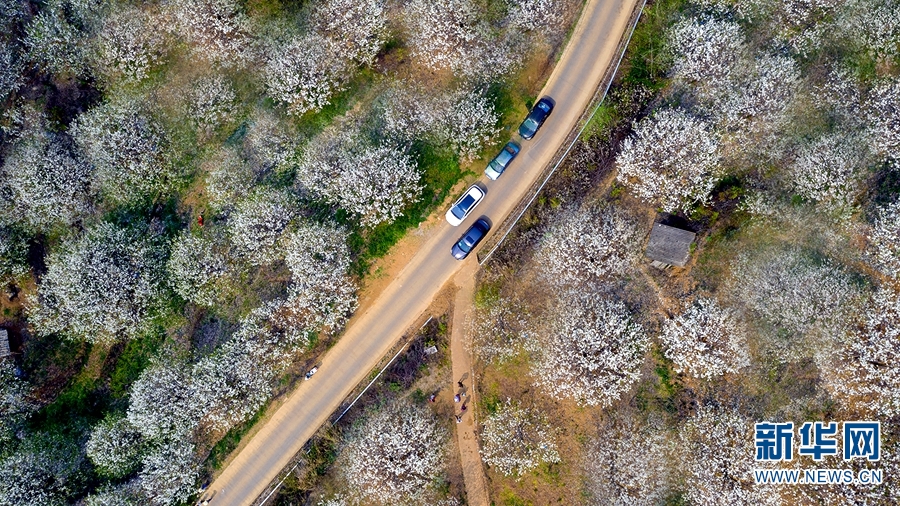 图为3月21日,航拍视角下的加级寨梨花谷。新华网发(陈畅 摄)