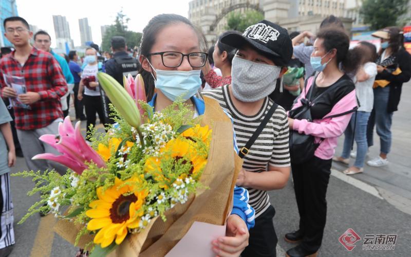 在昆明市第一中学考点,结束考试的考生收到鲜花祝福,心情格外激动。