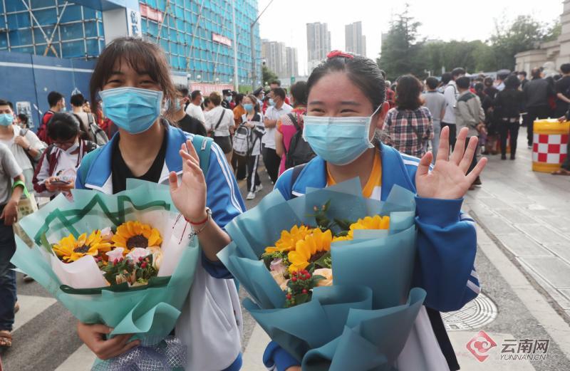 在昆明市第一中学考点,结束考试的考生手捧鲜花,心情放松。