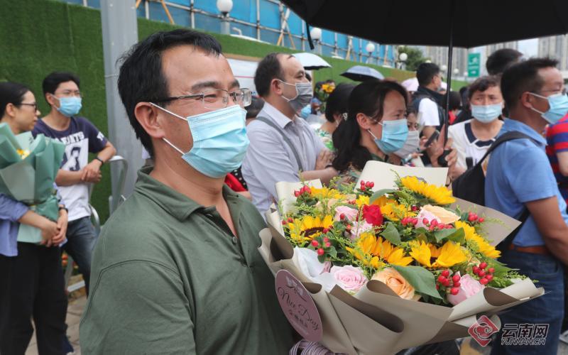 在昆明市第一中学考点,一名家长手捧鲜花准备为考试结束的孩子送上祝福。