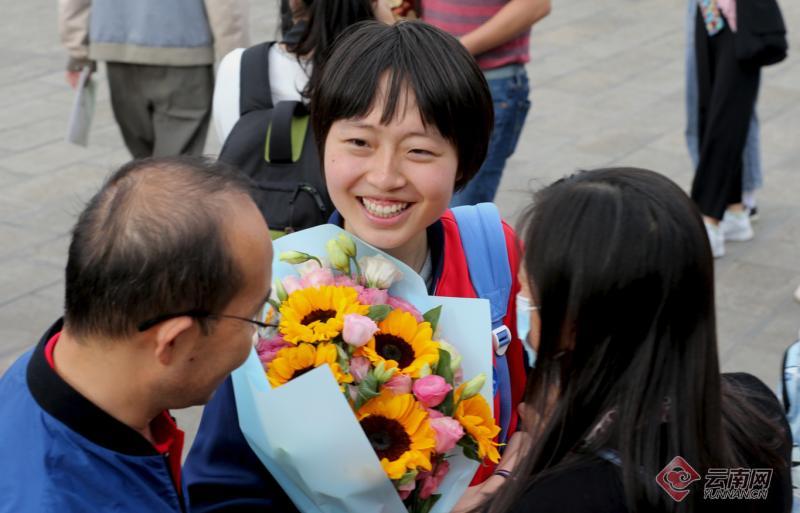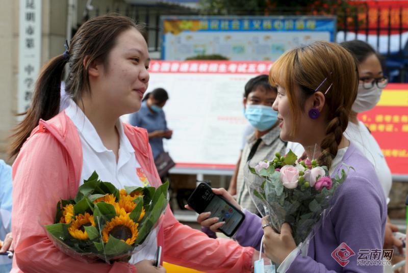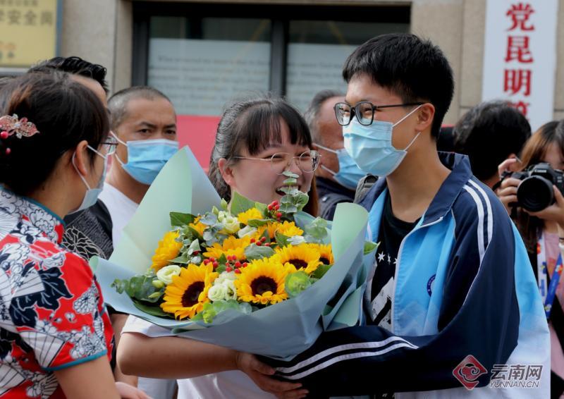 在昆明市第一中学考点,结束考试的考生收到鲜花祝福,心情格外激动。