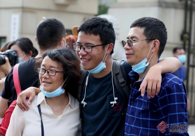 在昆明市第一中学考点,结束考试的考生和家人合影纪念。