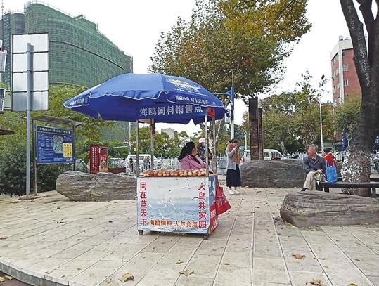 这里有两个红嘴鸥饲料销售摊点。“现在红嘴鸥还不是特别多,才来没有几天,每天中午12点左右,红嘴鸥相对多一点,喂鸥的市民也会多起来。”摊主说,他们是2日才开始摆摊的。