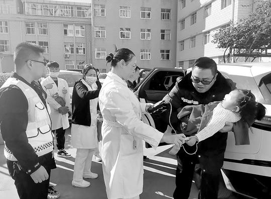 1月1日,昌宁县一名2岁幼女随父母外出时突发疾病出现昏迷。危急时刻,保山市公安局隆阳区交警大队民警迅速出警赶往汇合地,用警车开道,护送患儿安全送达医院仅用了10分钟,为其打通了生命通道。
