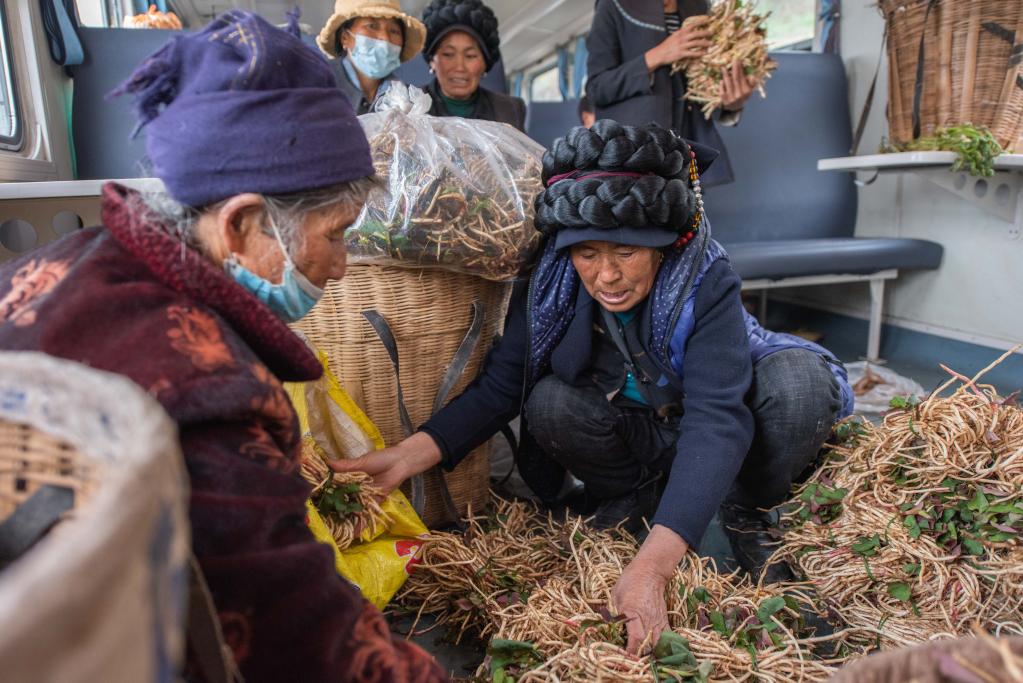 成昆铁路5633次列车的“流动集市”上,一名彝族妇女(前右)在挑选折耳根(2021年4月11日)。新华社记者胥冰洁 摄