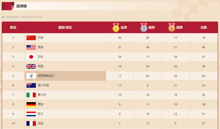 8月7日,东京奥运将进入最后两天的比赛争夺。在昨天的比赛中,中国新增2金2银1铜。截至8月6日,中国代表团以36金26银17铜的成绩继续领跑总奖牌榜,美国和日本分列第二、三位。