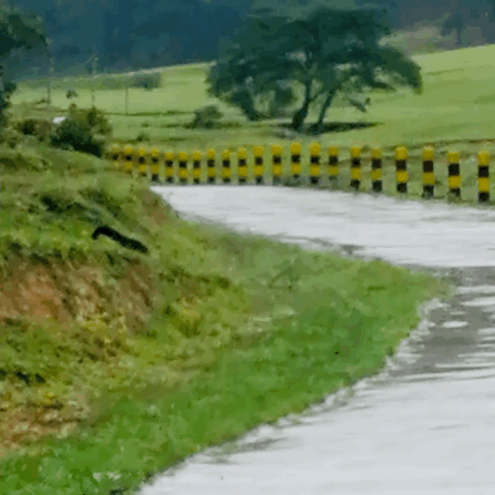 画面中,黄喉貂雨中蹦跶悠哉压马路,时而机灵蹦跳、时而伸头探望,还和拍摄者对视、点头“示意”,十分惹人喜爱。