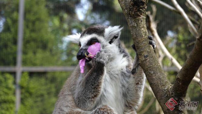 环尾狐猴是来自马达加斯加的“小精灵”,它们主要以树叶、花、果实及昆虫为食。春光明媚,只见它们摊开四肢,面向太阳,让温暖的阳光铺满全身,好不惬意。鲜花宴的到来吸引了它们的注意,很快,它们在树间攀爬跳跃向着美食而来,拿到美味的茉莉花后,它们会守在美食旁或择一个自己喜爱的地方细细品味。据园区工作人员介绍,茉莉花中含有酯类、茉莉花素等,不仅可以挥发动物体内油脂,还有抗菌消炎和抑制病原微生物的作用。对于动物们来说,这是一种新颖的营养物质获取方式。