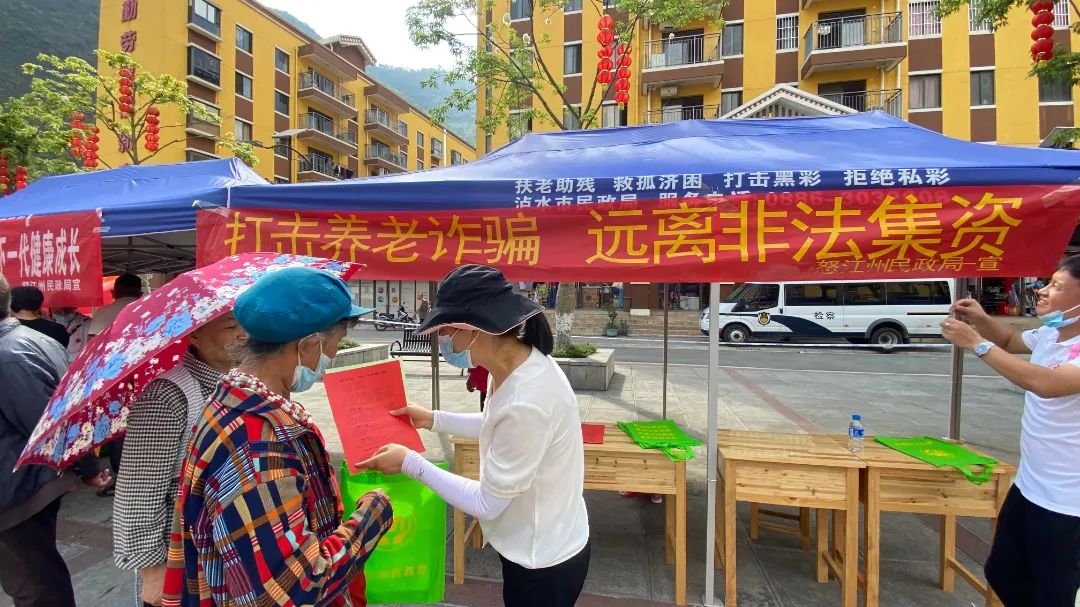 为深入贯彻落实打击整治养老诈骗专项行动的部署要求,切实提高老年群体对养老诈骗等犯罪行为的防范意识,守护老年人养老钱,日前,怒江州民政局在泸水市大练地街道和谐社区开展打击整治养老服务诈骗宣传活动。