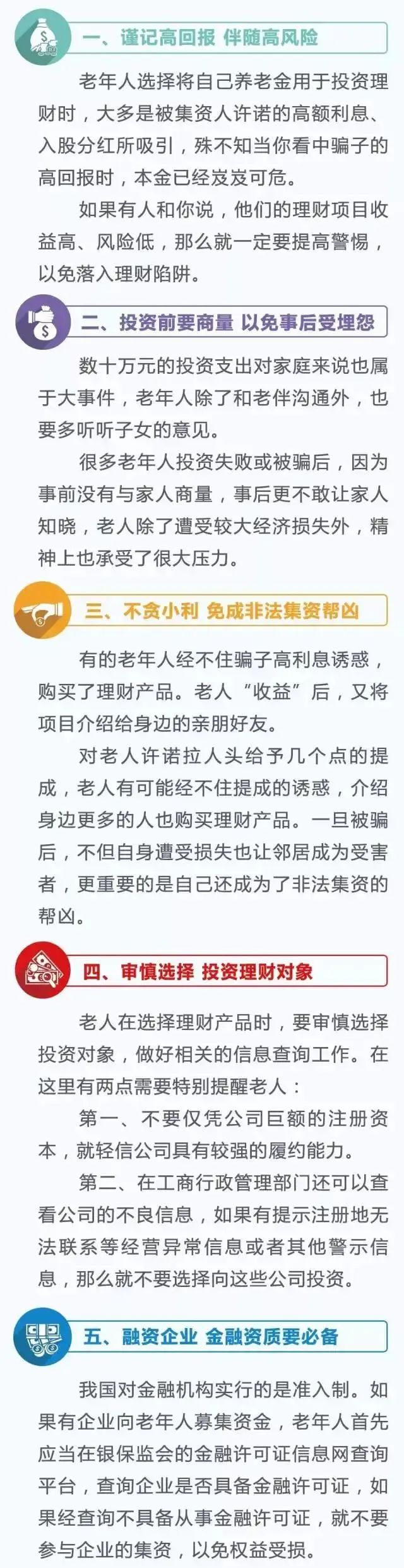 近年来,一些机构和企业打着“养老服务”“康养旅游”等名义,以“高利息、高回报”为诱饵实施非法集资活动吸收老年人资金,给老年人造成严重财产损失和精神伤害,存在重大风险隐患。