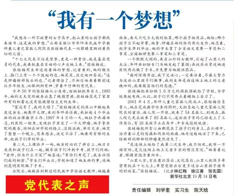 2007年10月15日新华每日电讯头版刊登张桂梅专访《我有一个梦想》
