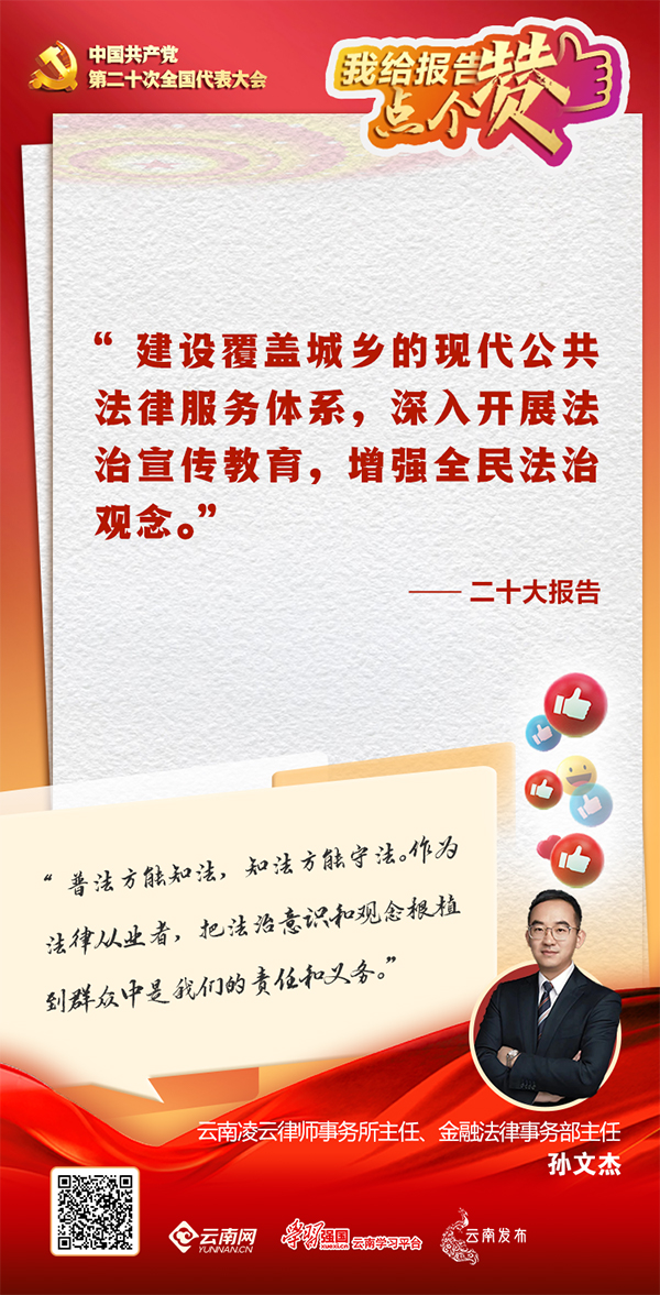“从以前的‘不懂法’‘不学法’,到现在的‘尊法、学法、守法、用法’观念在群众心中扎根,可以说是我这十年最大的感受。”云南凌云律师事务所主任、金融法律事务部主任孙文杰说。