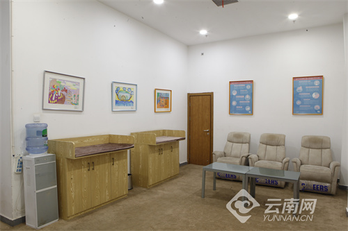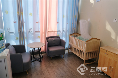 昆明站二楼候车大厅专门开设有重点旅客候车室,内设母婴室,并配有儿童乐园等服务设施。记者看到,母婴室设有帘子,里面配置婴儿床、饮水机、沙发、置物柜等,且整体干净卫生。
