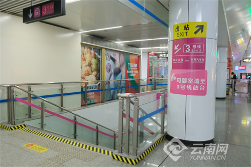 在昆明地铁东风广场站,一个醒目的粉红色母婴室标识指引着有需要的乘客前往3号线站台。据地铁站工作人员介绍,考虑到地铁站内现有的用房条件和用水需求,从2018年8月起,昆明地铁环城南路站、白云路站、潘家湾站等多个站点在站台内便陆续设置了专用母婴室,为携带宝宝的女性乘客提供方便。