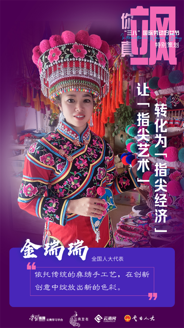 “一块绣布,一根绣针,千回百转间,留住了时间,留住了岁月。一丝一缕传承着经典文化,一针一线刺绣了幸福生活。”彝族刺绣是金瑞瑞带上全国两会的一份浓厚的云南“色彩”。她说:“作为全国人大代表,我一定要为彝族刺绣代言,让云南从绣服之美、云南民族文化之美,依托传统的彝绣手工艺,在创新创意中绽放出新的色彩。”金瑞瑞说,同时,她也一定会做好新时代的民族产业领头人,认真履职、为人民发声,为人民代言。