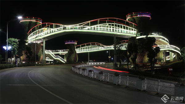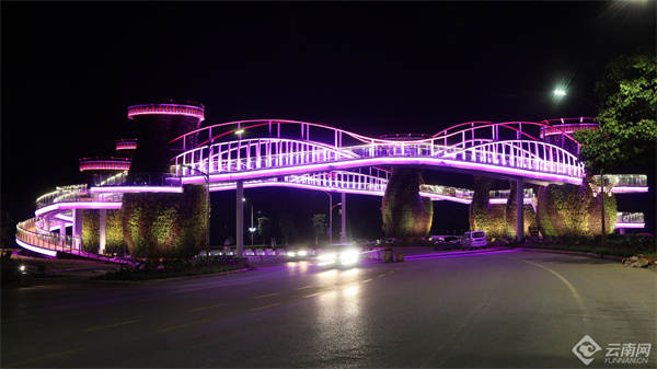 夜色阑珊,屏边县新老城区交接处,双龙天桥灯光璀璨。天桥呈圆形横跨屏边大道,七个“溪笼”状柱体分布于公路两侧,杜鹃、黄连翘、木瓜海棠等特色植物立体缠绕在花瓶状瓶身上,在灯光映衬下更加生机盎然。“我们通过立体绿化、灯光亮化等手段,在保持区域协调、发挥基础设施作用的前提下,打造有辨识度和吸引力的绿化和绿美景点。双龙天桥就是其中的代表,深受市民喜爱。”屏边县城市园林绿化管理站站长周理能告诉记者。